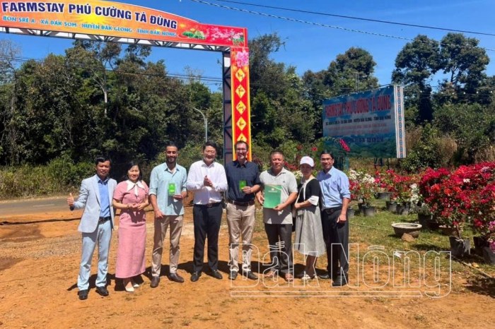 Giám đốc Sở VHTTDL Nghiêm Đình Hiếu lì xì đầu năm cho du khách nước ngoài đang tham quan tại Farmstay Phú Cường Tà Đùng ở xã Đắk Som, huyện Đắk Glong