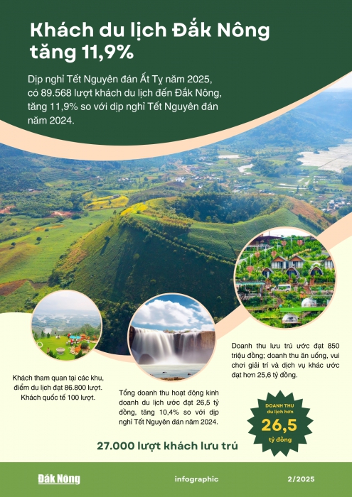 Theo thống kê, chỉ tính riêng những ngày Tết Nguyên đán Ất Tỵ năm 2025, có 89.568 lượt khách du lịch đến Đắk Nông, tăng 11,9% so với dịp nghỉ Tết Nguyên đán năm 2024. Trong đó, khách tham quan tại các khu điểm du lịch đạt 86.800 lượt; khách lưu trú đạt 2.700 lượt, khách quốc tế 100 lượt. Tổng doanh thu hoạt động kinh doanh du lịch ước đạt 26,5 tỷ đồng, tăng 10,4% so với dịp nghỉ Tết Nguyên đán năm 2024. Trong đó, doanh thu lưu trú ước đạt 850 triệu đồng; doanh thu ăn uống, vui chơi giả trí và dịch vụ khác ước đạt hơn 25,6 tỷ đồng.